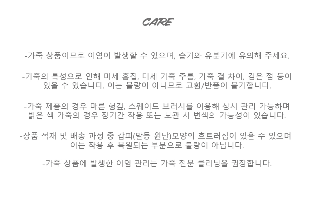 + 소재 특성상 드라이크리닝, 찬물로 손세탁만 가능하며, 건조기 사용은 절대 금합니다.