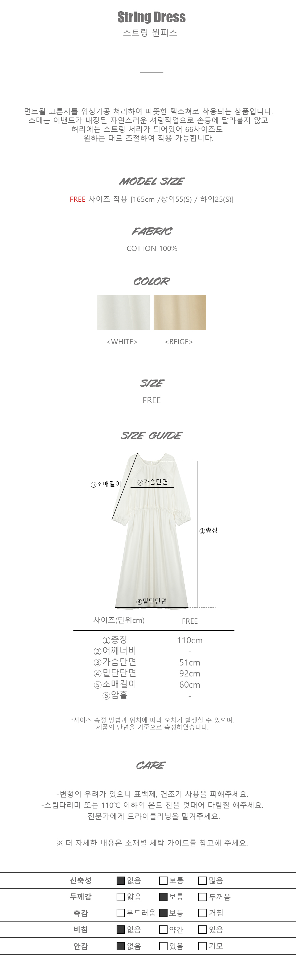 - 물세탁은 가능하지만, 높은 온도에 약한 소재이므로 삶거나 높은 온도에서 다리시면 안됩니다.