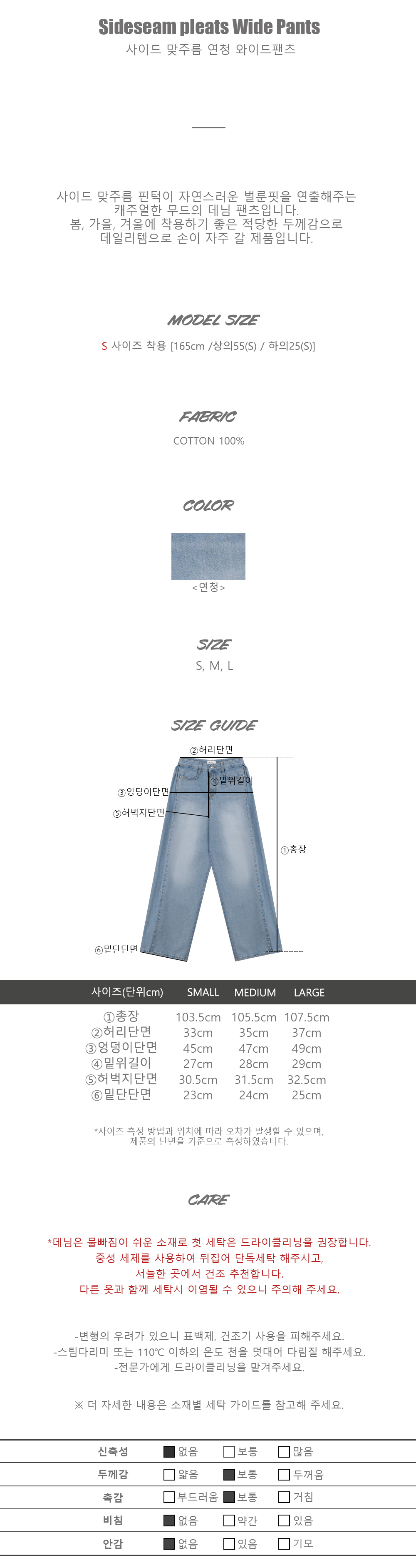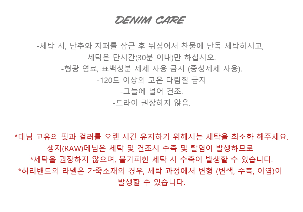 ▪데님 원단 특성상 물빠짐이 있을 수 있으므로 단독 세탁을 권장합니다.